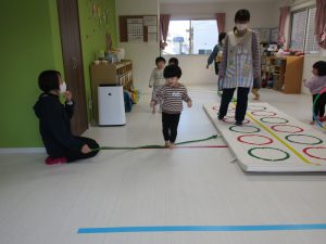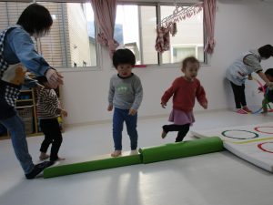平均台やニョロニョロ動く紐を飛び越えて何度も繰り返しました(^_^)