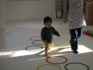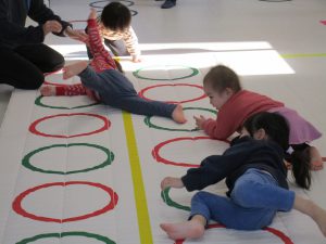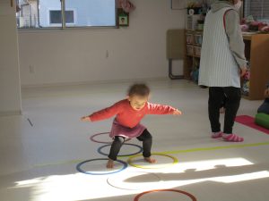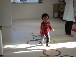 音楽に合わせて体を動かしたり、フラフープのトンネルをくぐり、