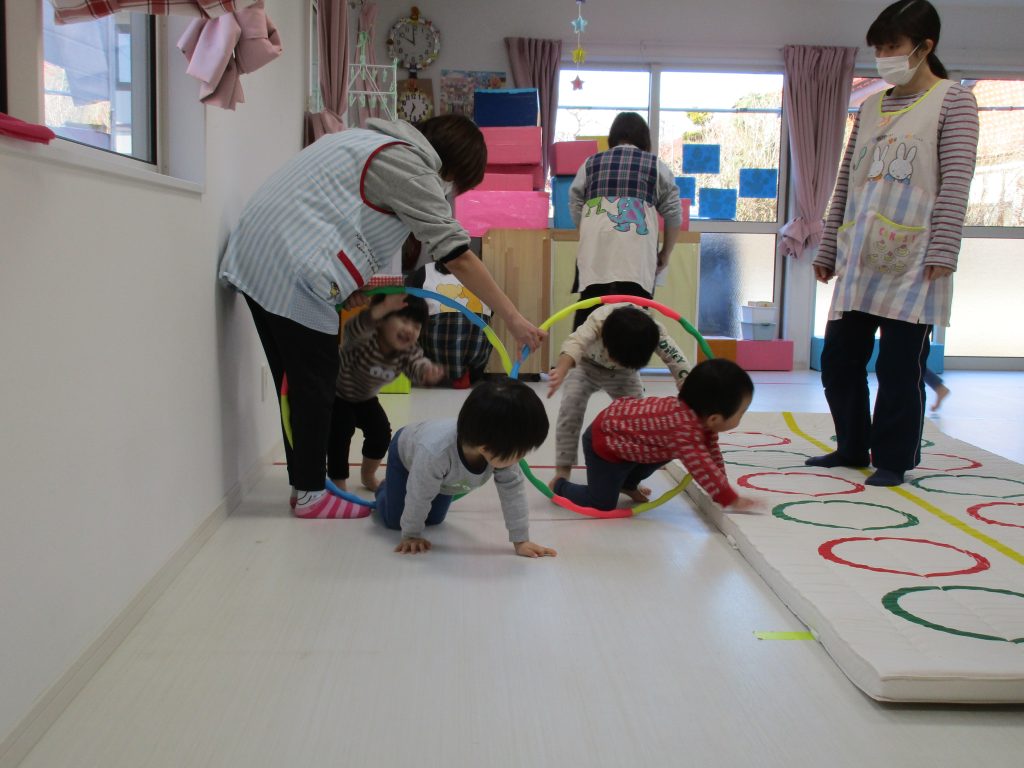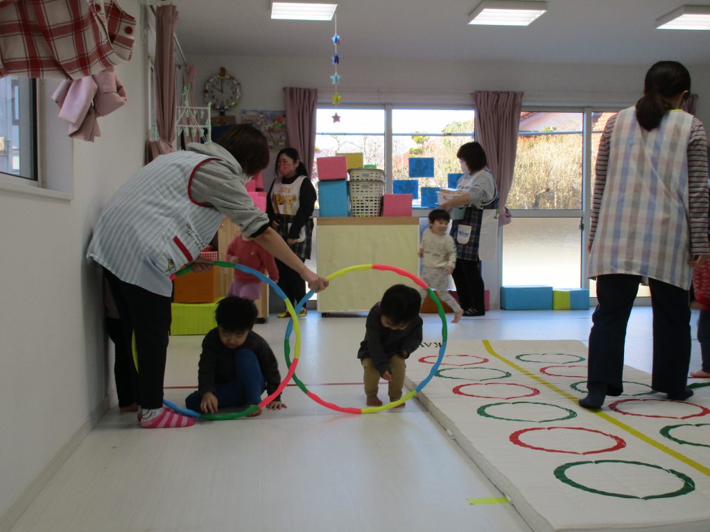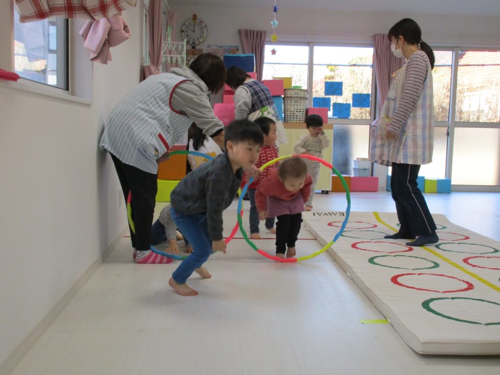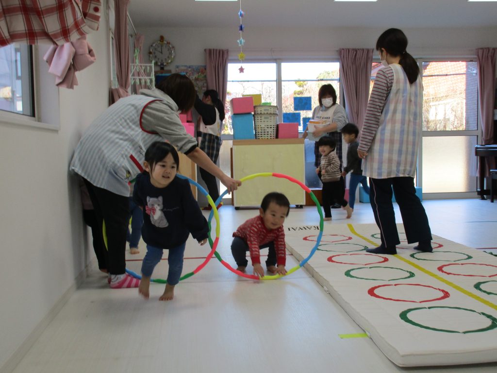 音楽に合わせて体を動かしたり、フラフープのトンネルをくぐり、