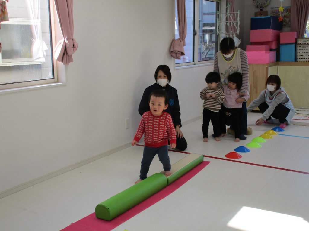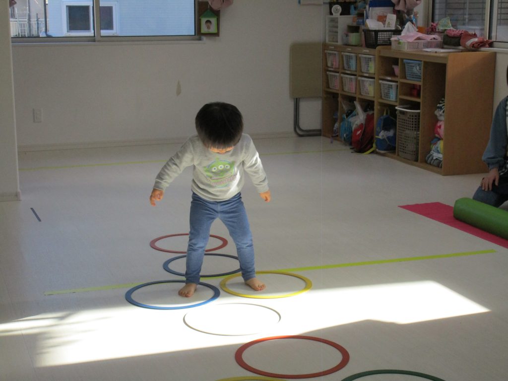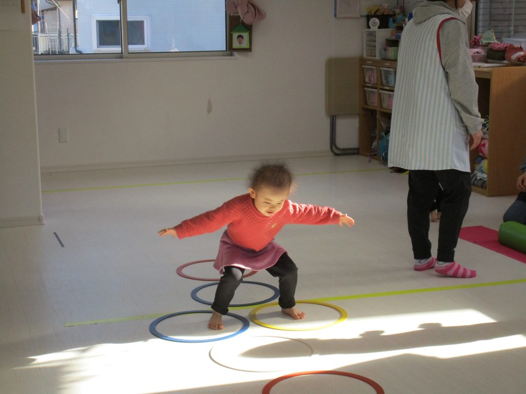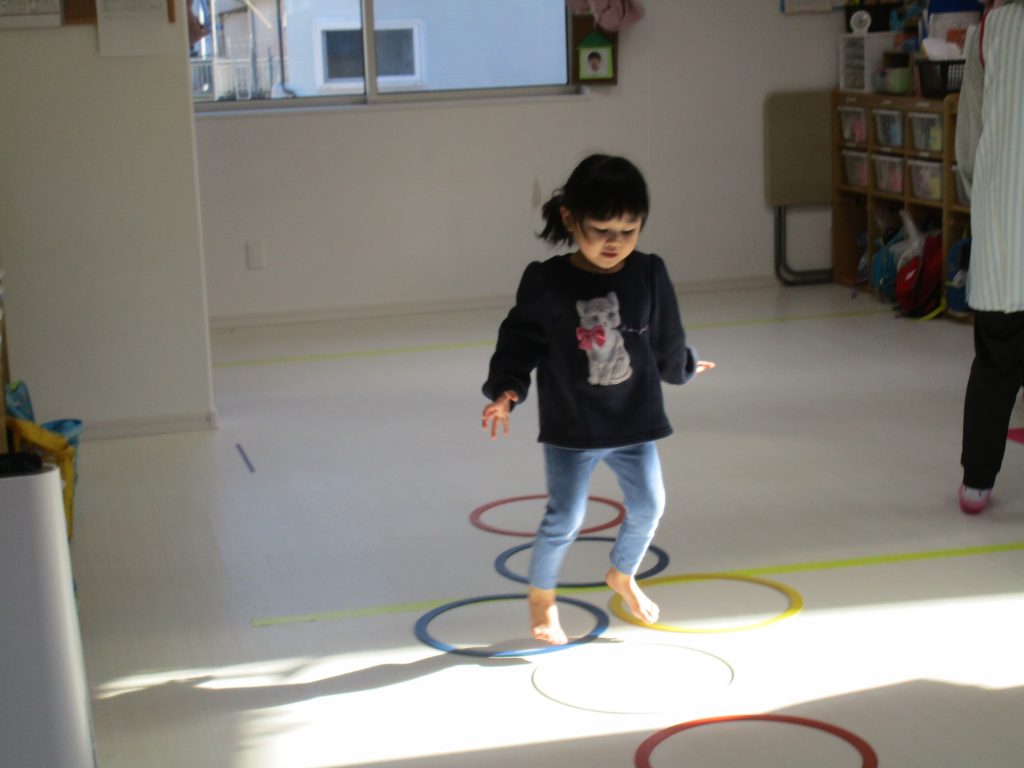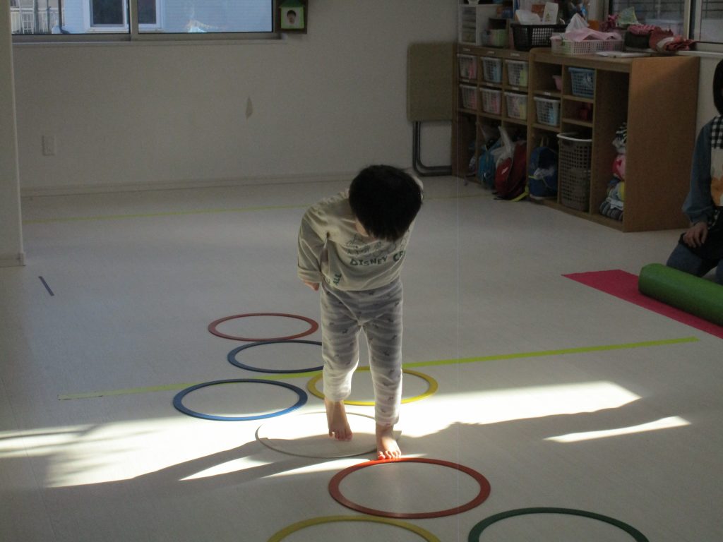 平均台を渡り、並んだ輪っかをグーグーパーで進みます!!