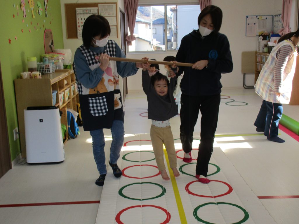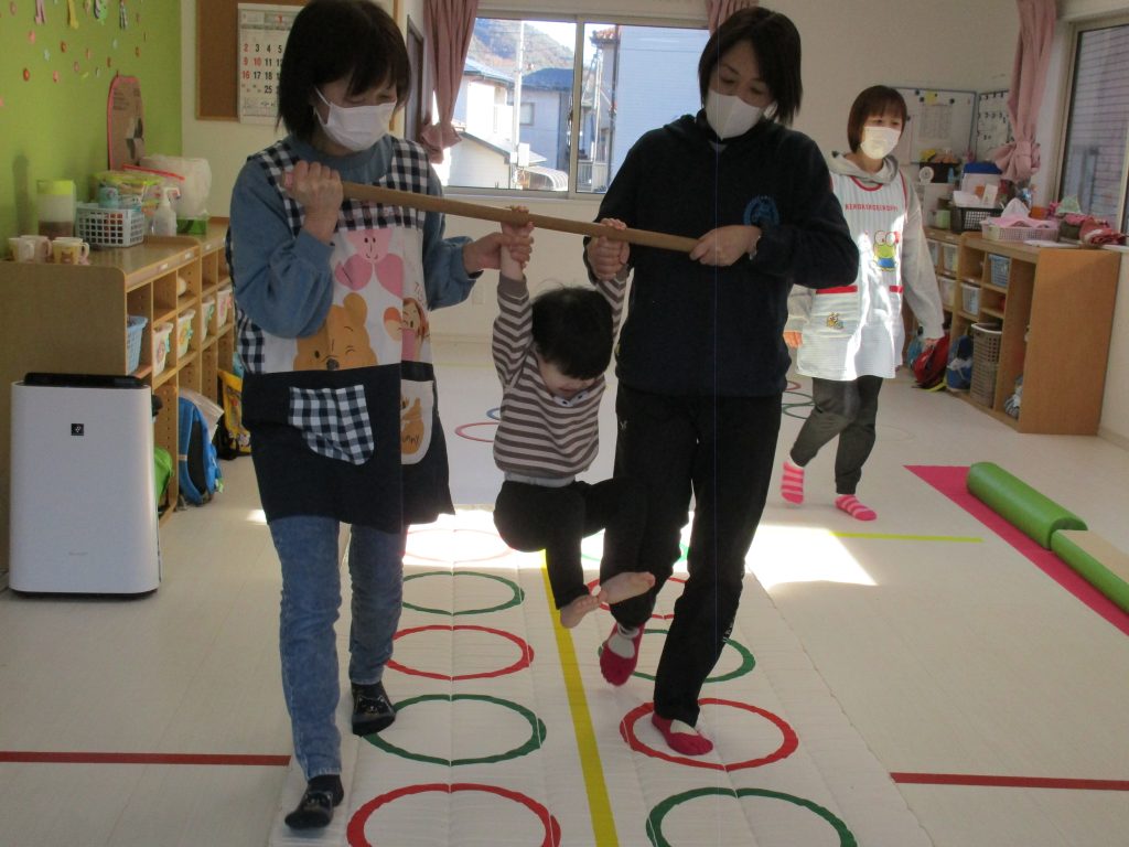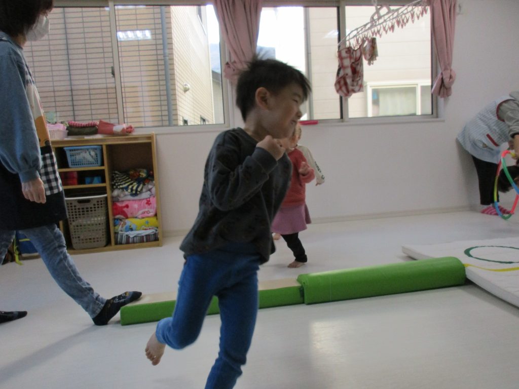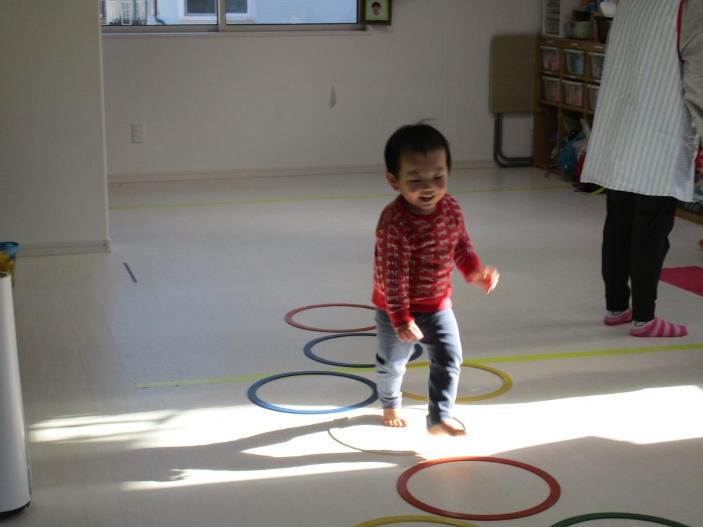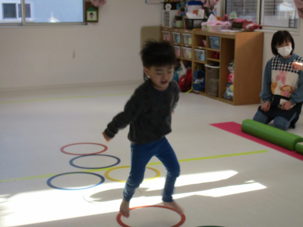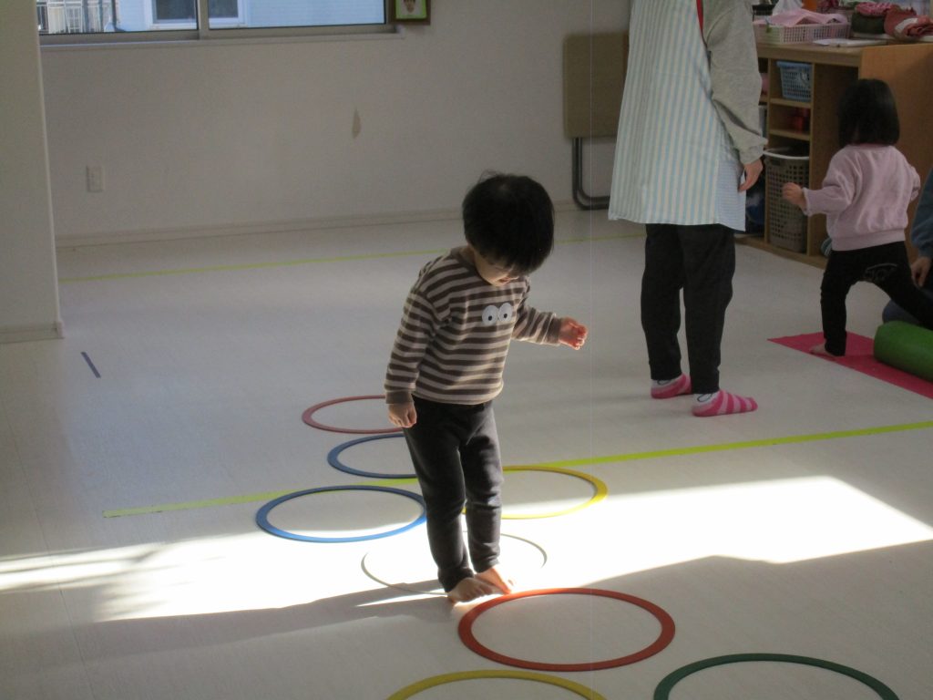 平均台を渡り、並んだ輪っかをグーグーパーで進みます!!