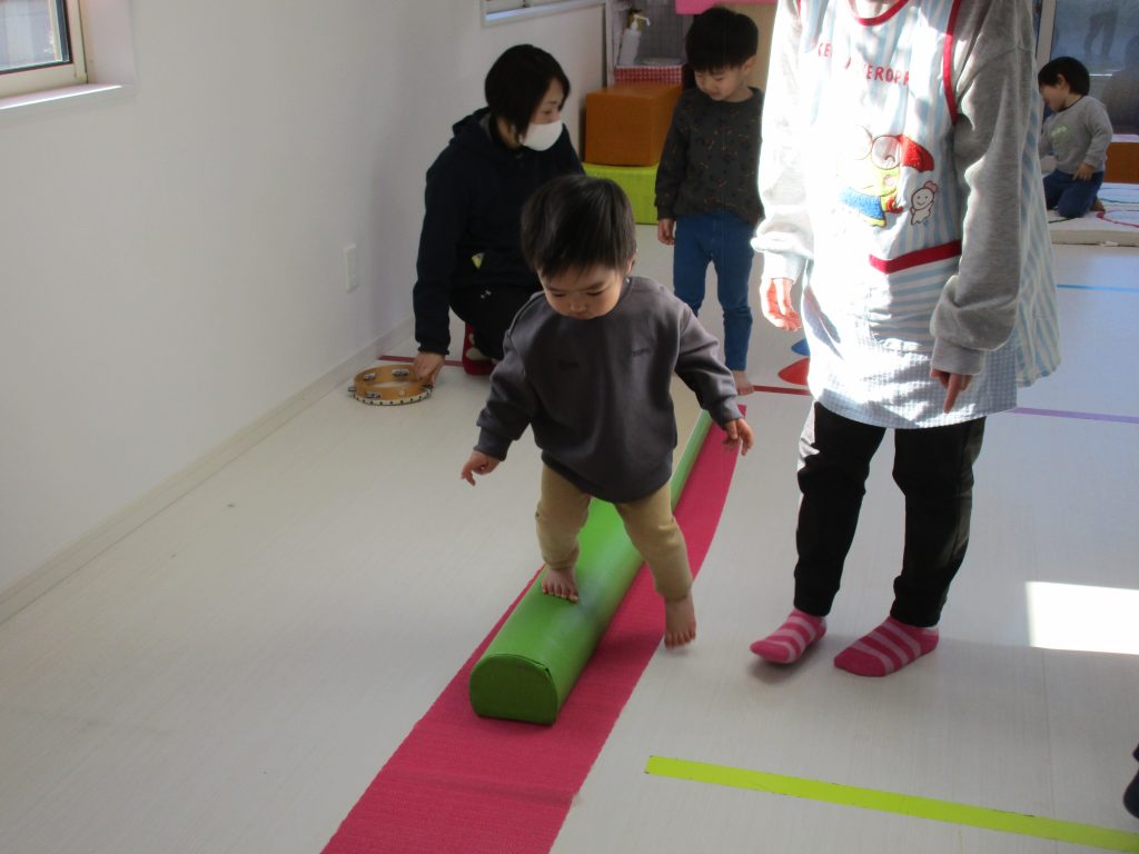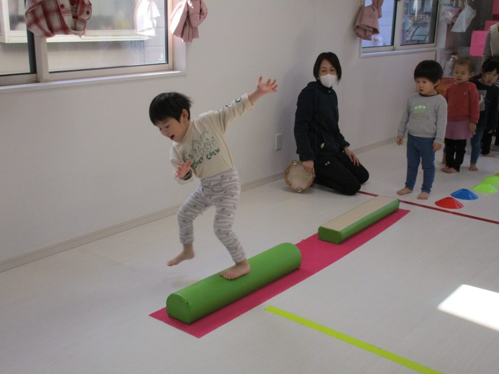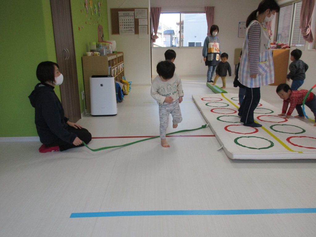 平均台やニョロニョロ動く紐を飛び越えて何度も繰り返しました(^_^)