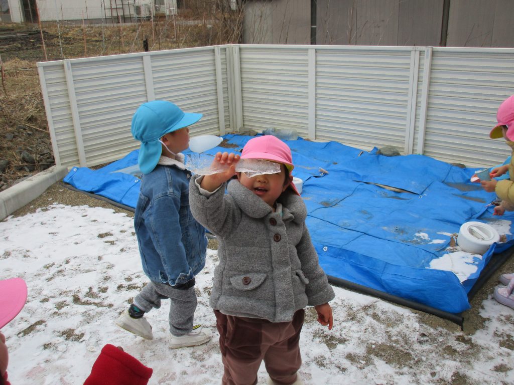 雪を踏んで足跡を付けたり、氷を見つけて触ってみたり