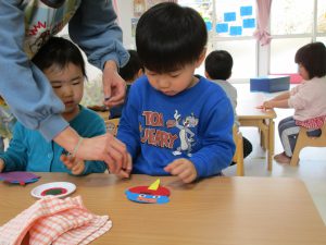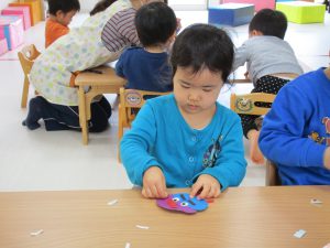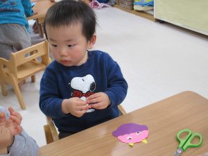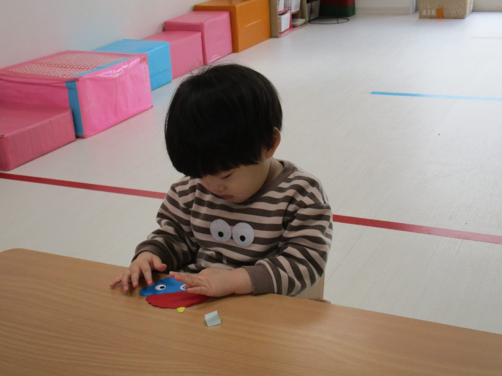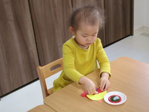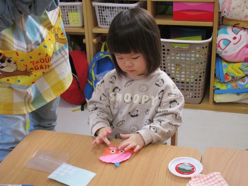 2歳児さんは上手に貼れるようになり、更には作業のペースが早くなり、