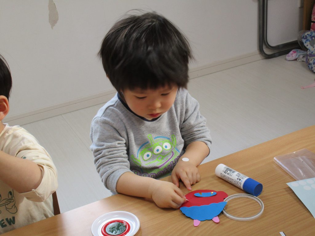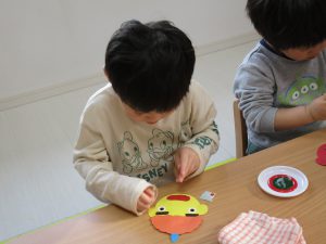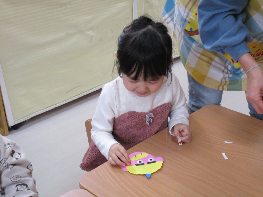 2歳児さんも鬼のお顔のパーツ、眉毛・目・ほっぺはシールで貼り、