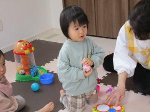 好きな玩具を選んで遊び、音の出る玩具を好んで遊ぶ姿が見られました(^_^)