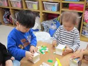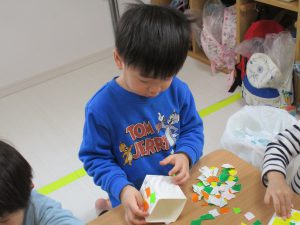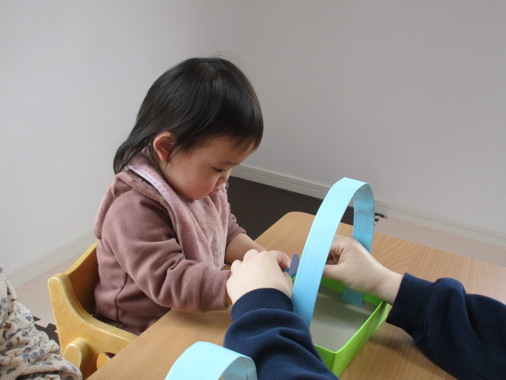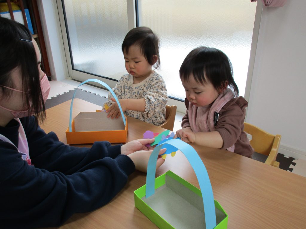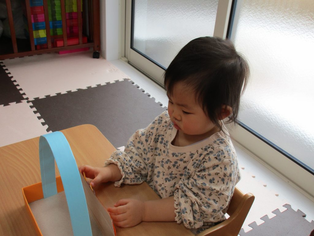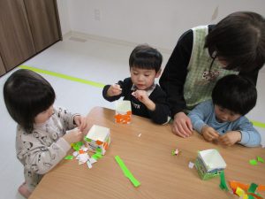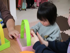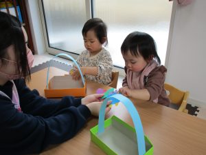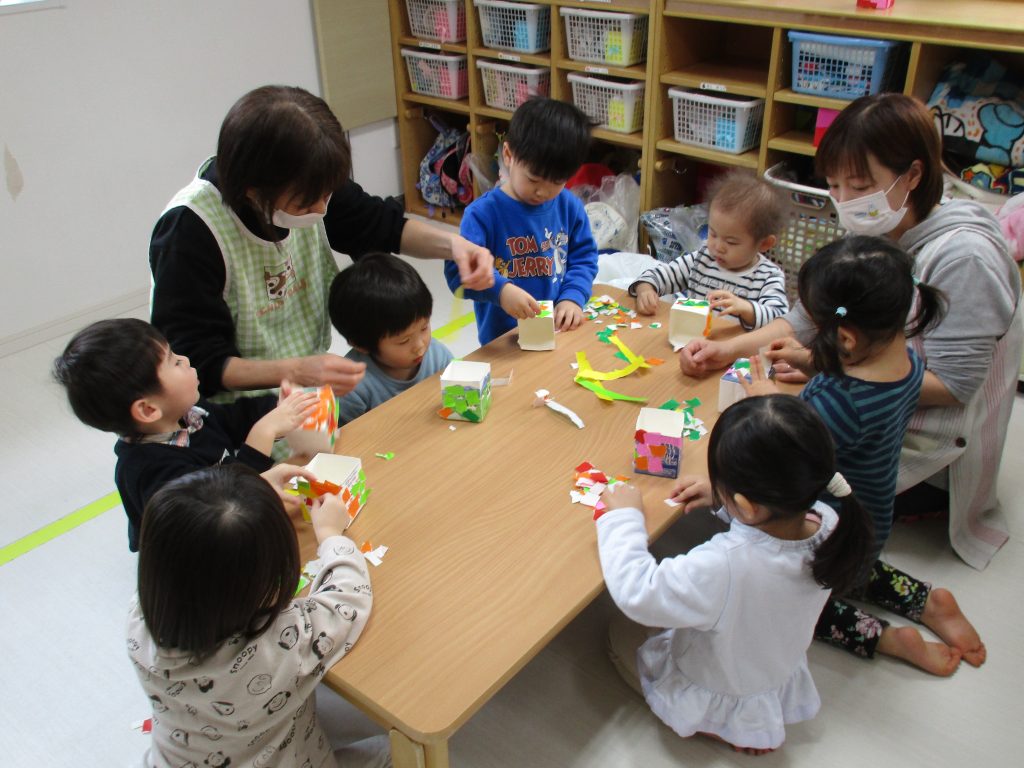 0歳児さんは節分に使う豆入れの製作をしました!!