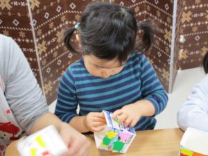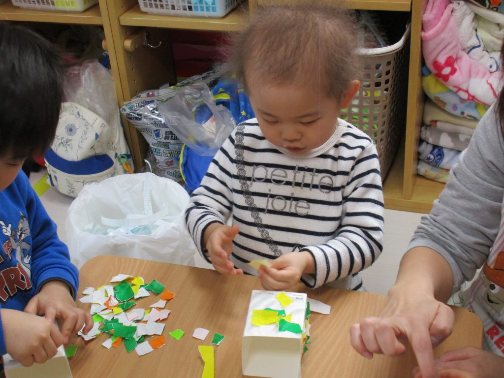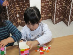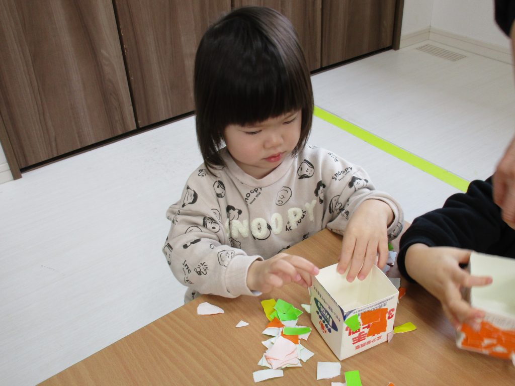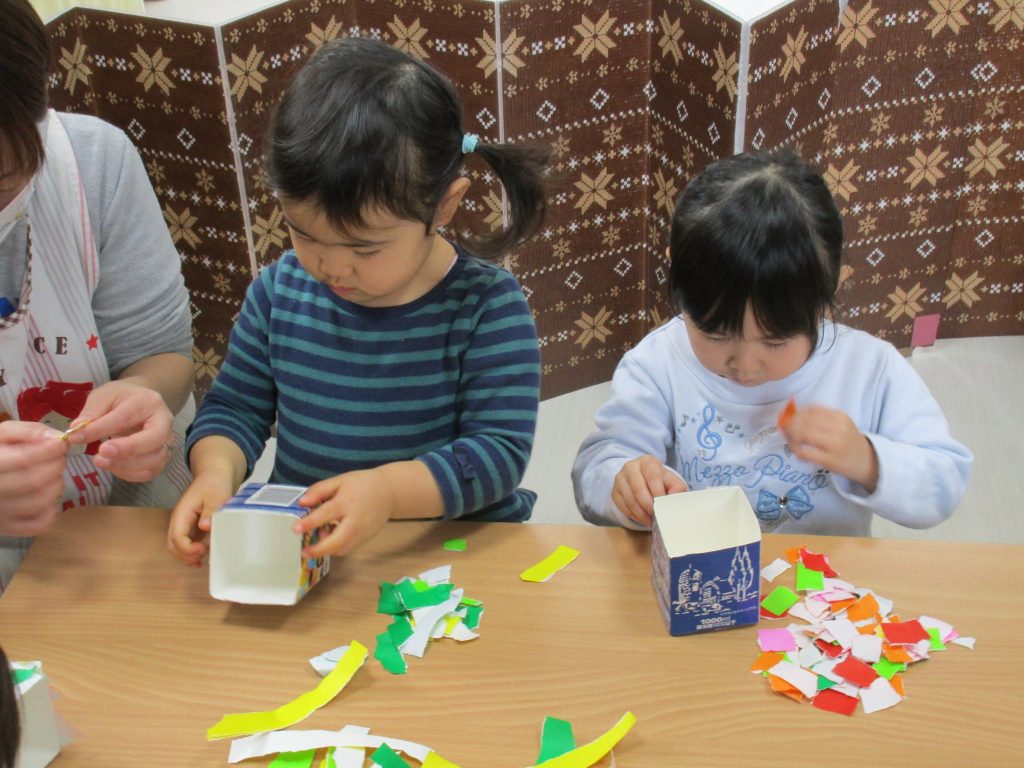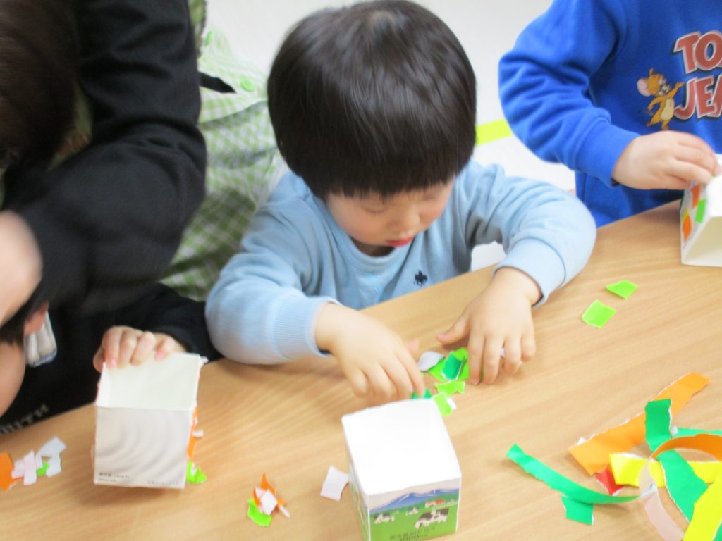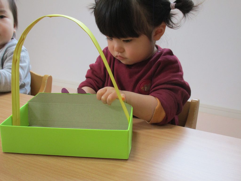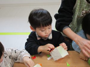 2歳児さんも節分に使う豆入れの製作をしました!!