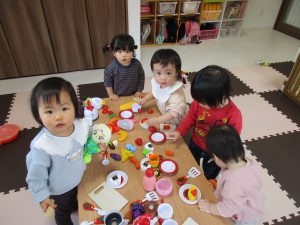 0歳児さん、テーブルにたくさんのままごとを並べて、