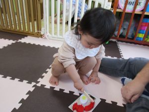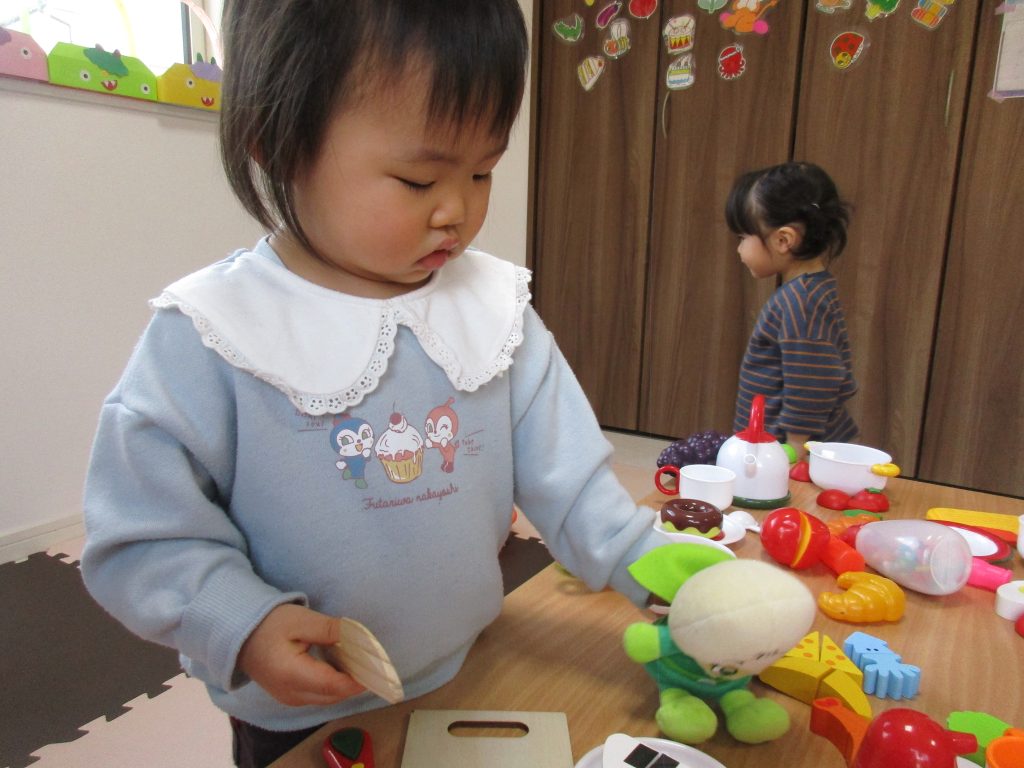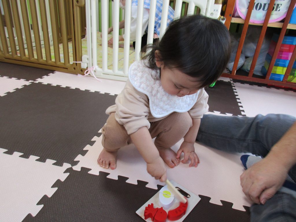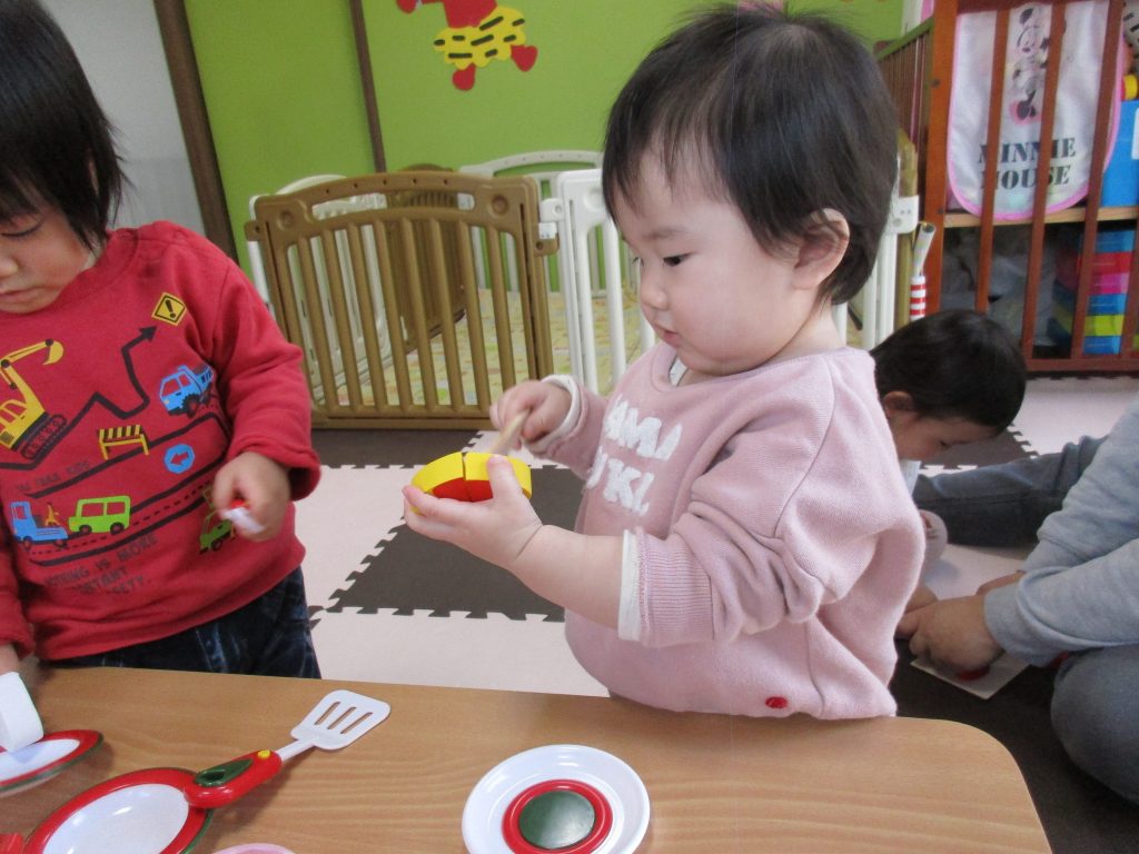 0歳児さんはぬいぐるみとままごと遊び、