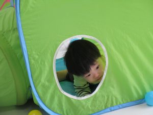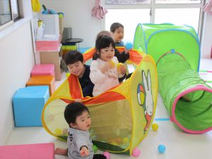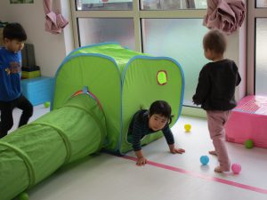 1・2歳児さんはすべり台やトンネル・マットなどで遊びました!!