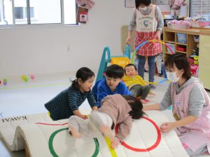1・2歳児さんはすべり台やトンネル・マットのお山などで