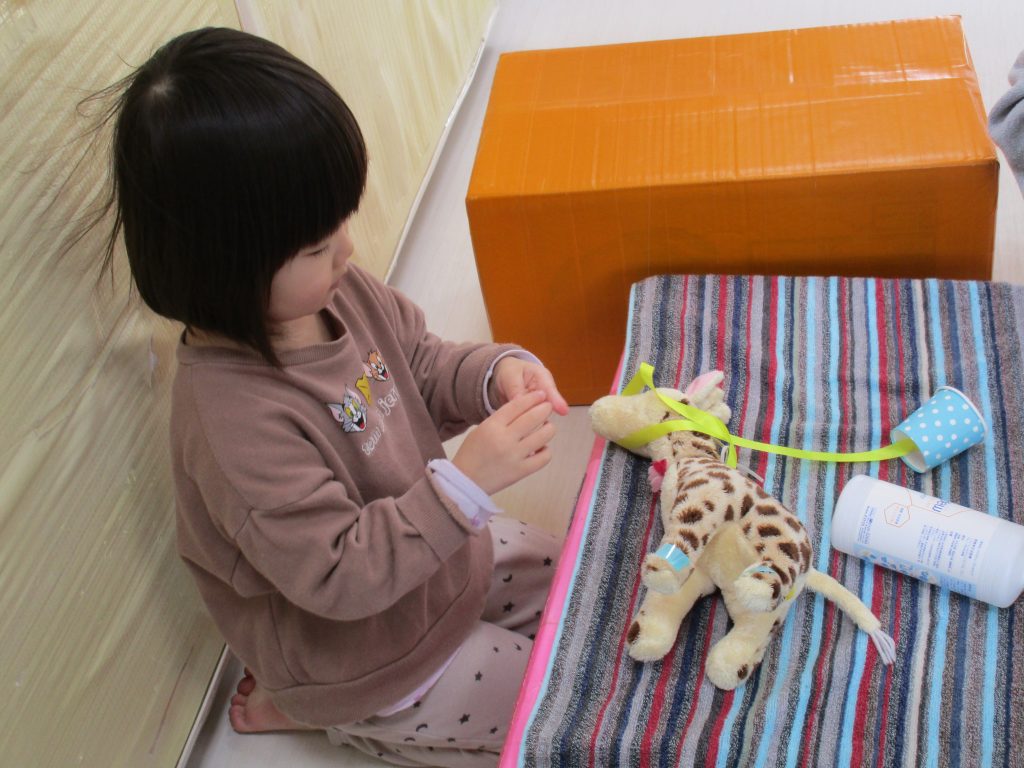 お医者さん役はベッドの上にぬいぐるみを乗せて聴診器を当てたり、