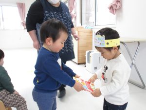誕生児さんの好きなお友達に絵本のプレゼントを渡してもらいましたが