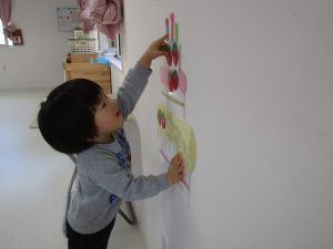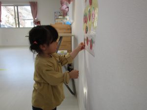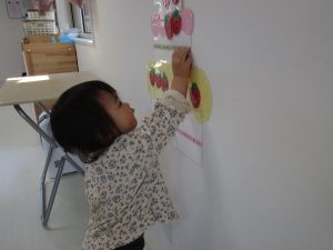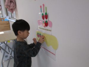 一人ずついちごを飾り、誕生児さんは自分の名前の書いてある