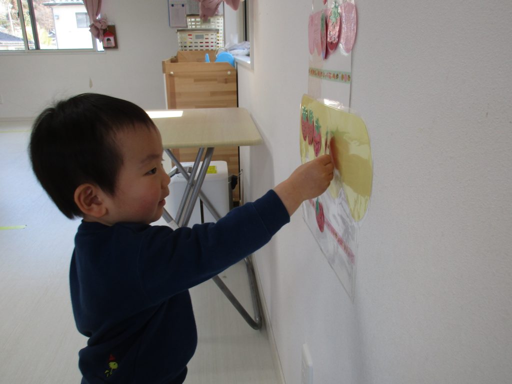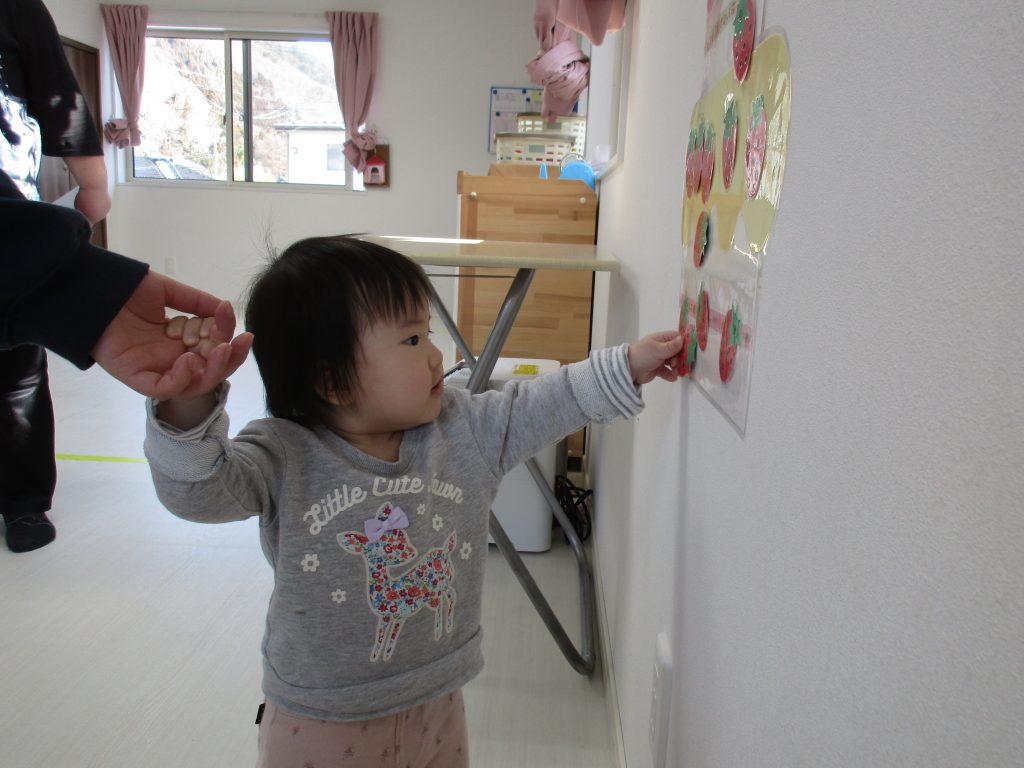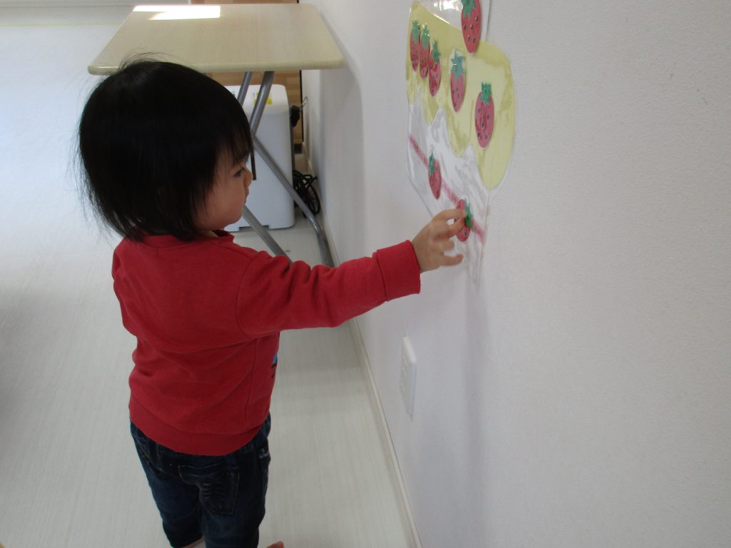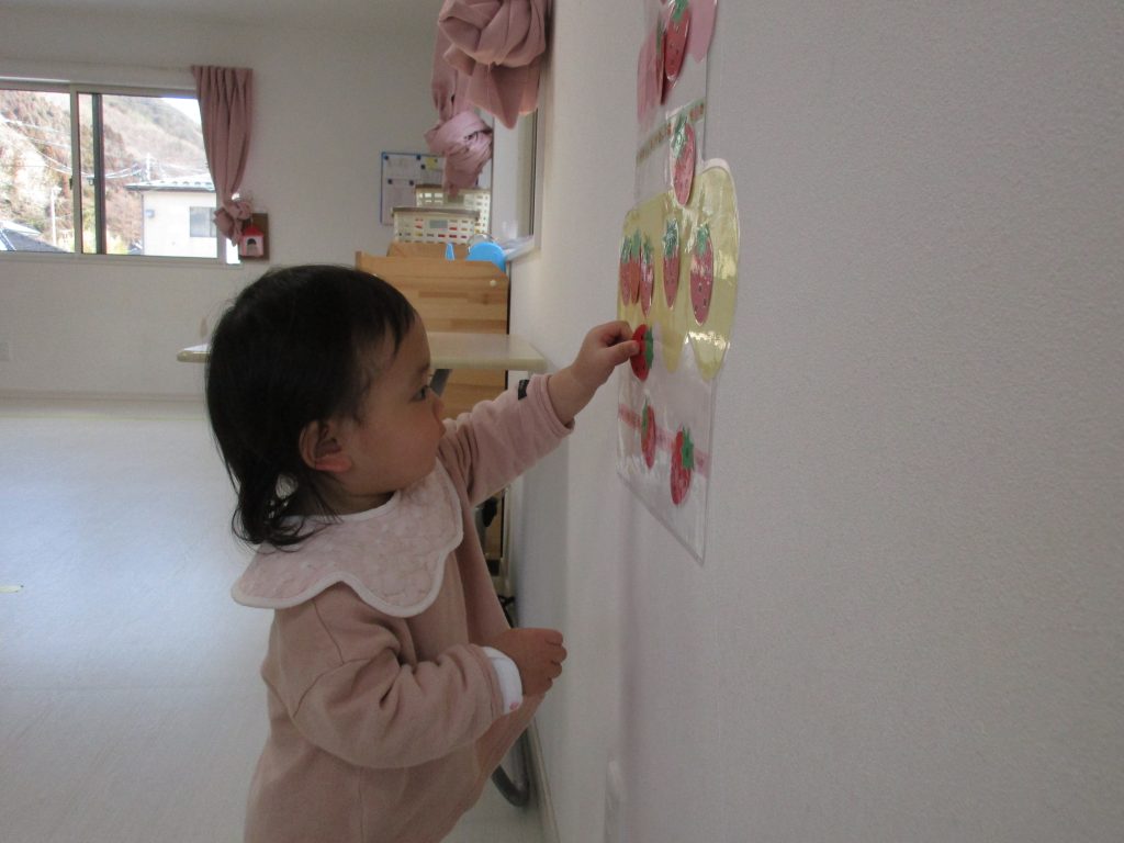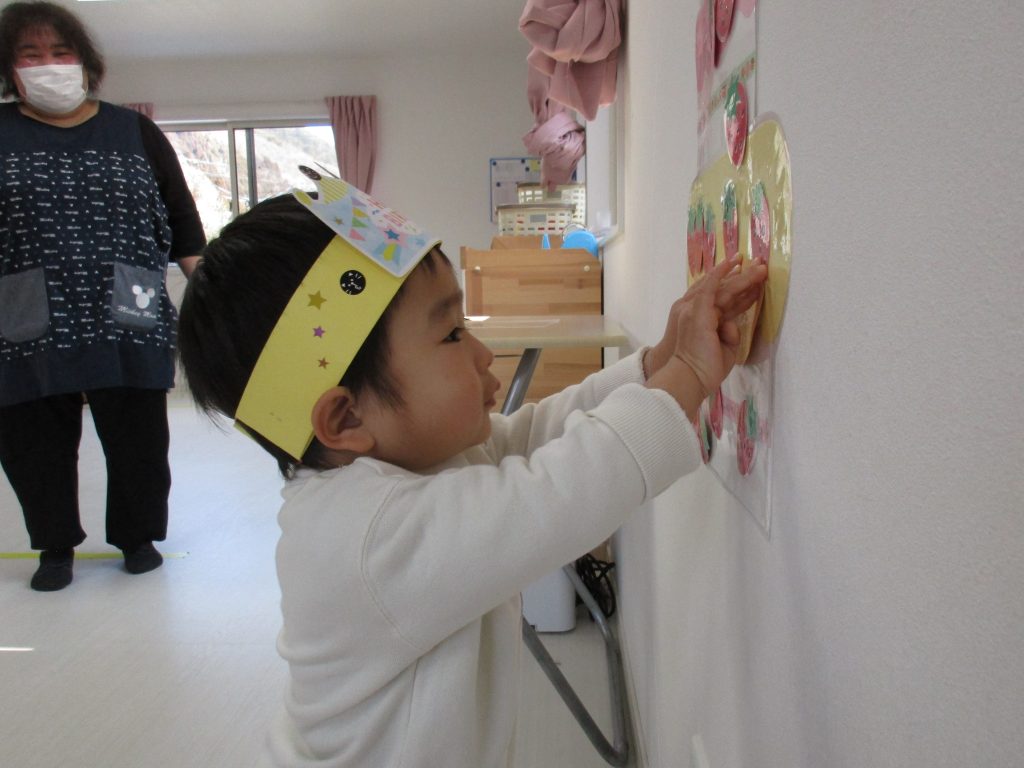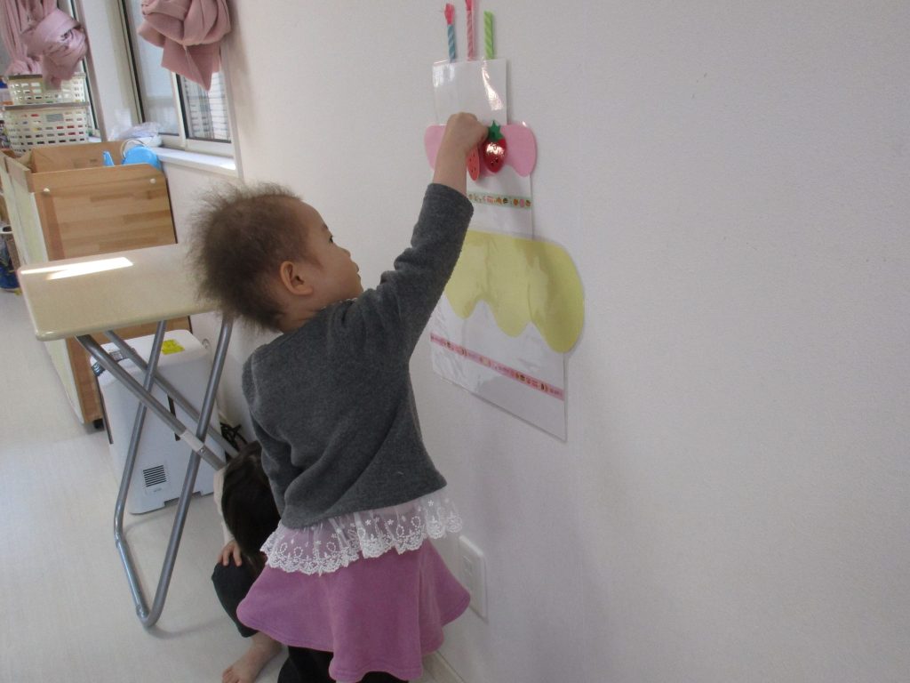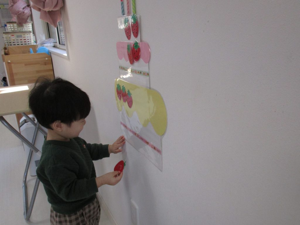 一人ずついちごを飾り、誕生児さんは自分の名前の書いてある