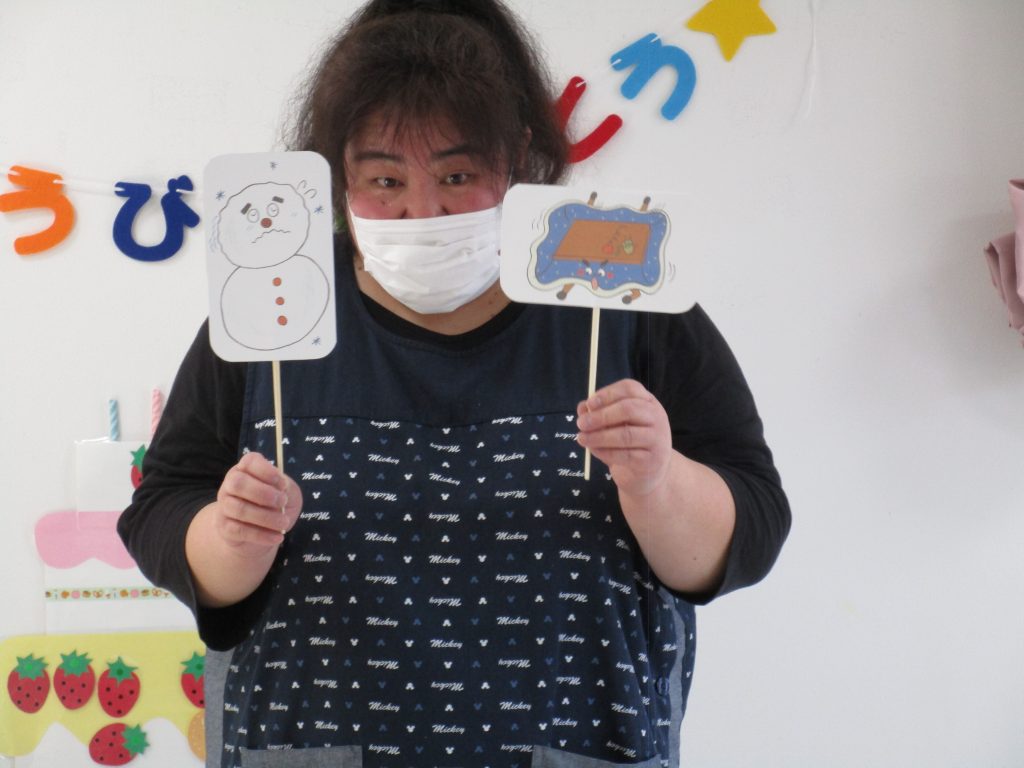 先生からの出し物1つ目はペープサート「ポカポカ こたつマン」です!!
