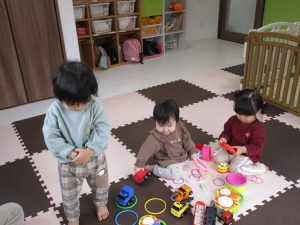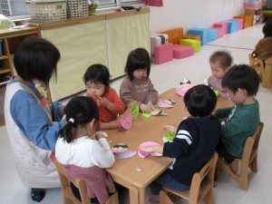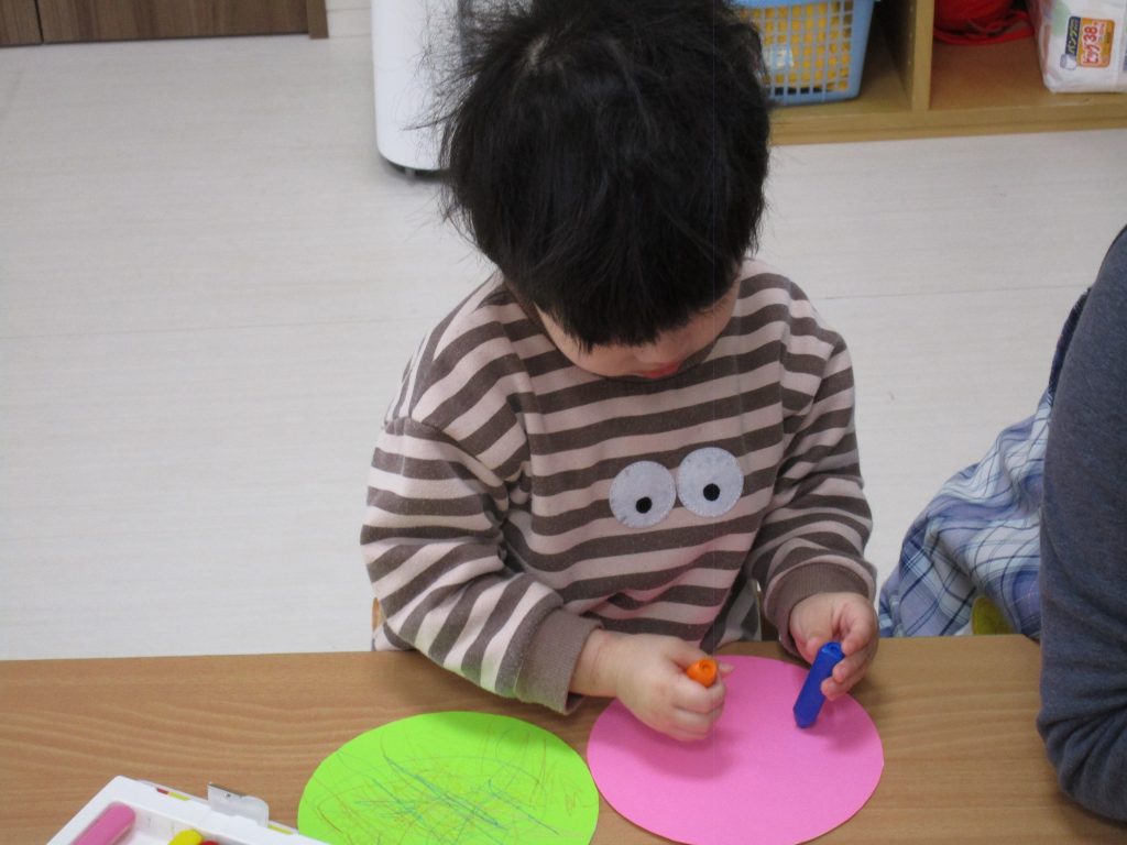 0歳児さんは玩具遊び、1・2歳児さんは製作をしました(^_^)