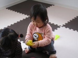 1歳児さんのお留守番のお友達と一緒にお部屋で