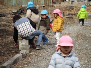 お外に出る前に、隣りのおじさんの畑にお花などの芽が