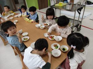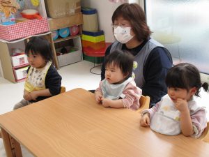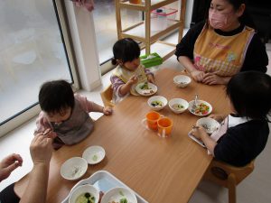 今日は0歳児さんも1・2歳児クラスのお部屋で一緒に食べました(*^_^*)