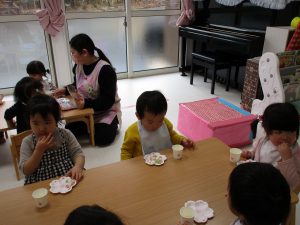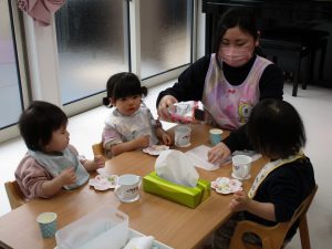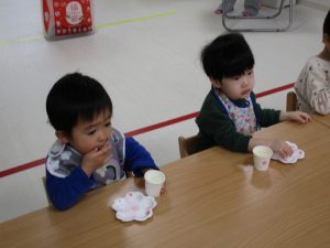 可愛い器にひなあられを入れてもらい、美味しそうに食べる子ども達です!!