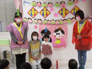 先生からの出し物2つ目は「みんなでおひなさま!」の
