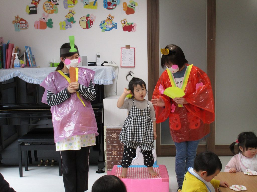 先生からの出し物2つ目は「みんなでおひなさま!」の