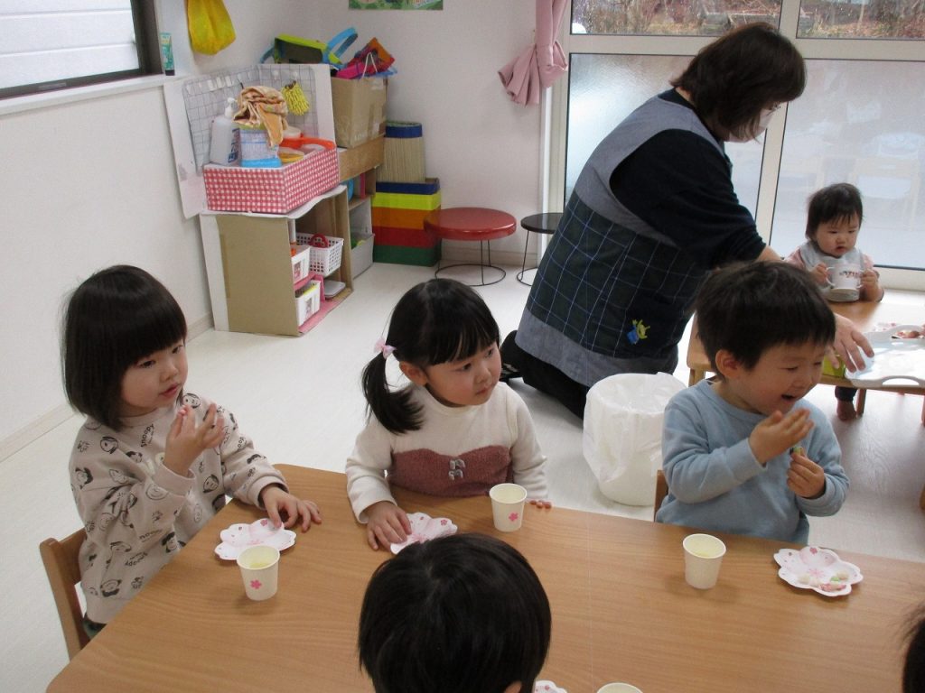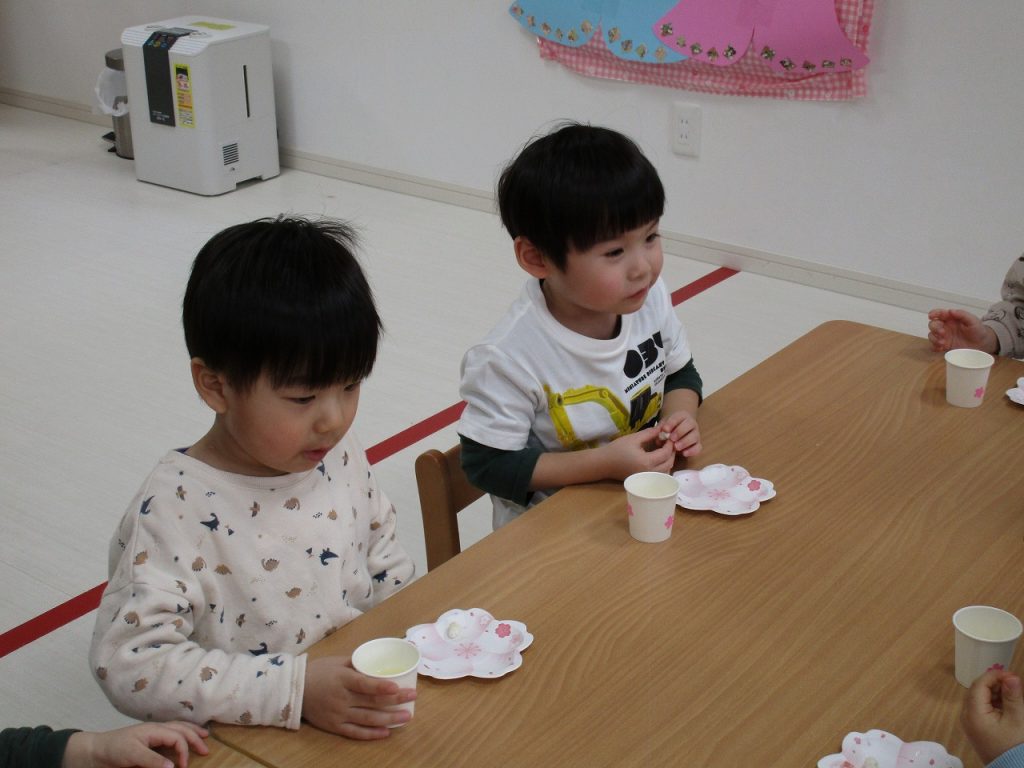可愛い器にひなあられを入れてもらい、美味しそうに食べる子ども達です!!