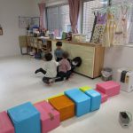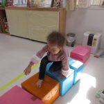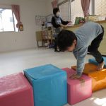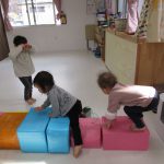 ダンボールの積木を並べてその上を四つん這いで歩いたりして