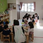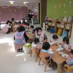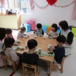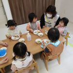 0歳児さんはデザートを先生と一緒に自分の場所まで運んだり、