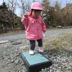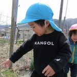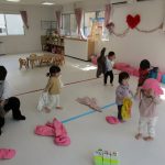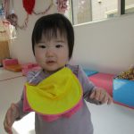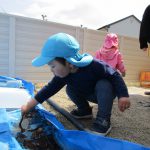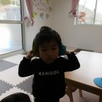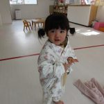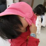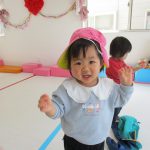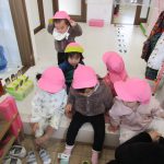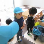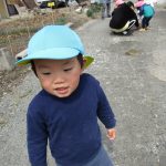 「お外に行くから準備するよ。」と声をかけると、靴下を履いたり、帽子を被ったり、自分で準備を頑張る子ども達です。