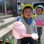 保育園に着くと、2歳児さんは日課のチューリップの水やりです。