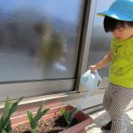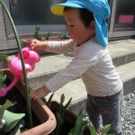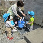 保育園に着くと、2歳児さんは日課のチューリップの水やりです。