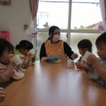 今日は朝から1歳児さん、2歳児さん一緒のお部屋で過ごしました。