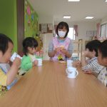 おやつの牛乳も、一人でコップを持って上手に飲めますよ。