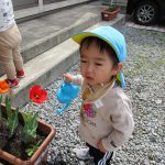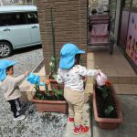 戸外遊びでは、2歳児さんは日課のお花への水やりをしました!!