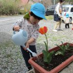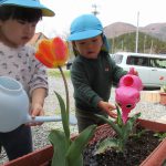 すっかり暖かくなり、園庭のプランターのチューリップも