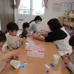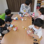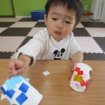 折り紙の裏に付いている両面テープを剝がすのが難しいお友達は、先生に手伝ってもらいながら頑張りました。