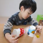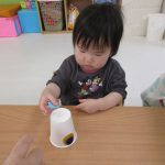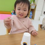 1歳児さんは、紙コップの体に折り紙の鱗を貼りました。