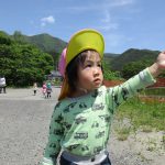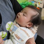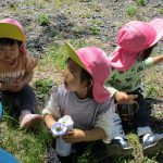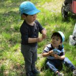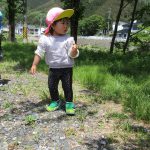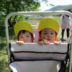 0歳児さんのお友達は先生に抱っこで園庭を散策して、