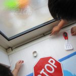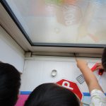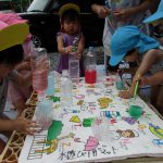 子ども達は使い古したマーカーをカップの水の中に入れて