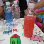 ペットボトルに入った色水をカップに注いだり、