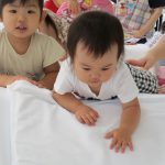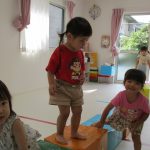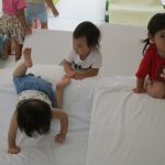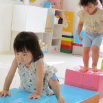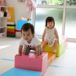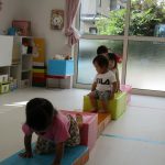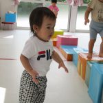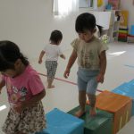 0・1歳児さんはダンボールの積木の橋を渡ってすべり台をすべったり、