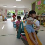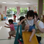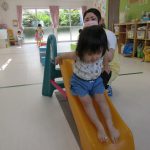 今日は2歳児さんは粘土遊び、0・1歳児さんはすべり台や