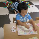 パズルとブロックコーナーを作り、パズルコーナーは一つのテーブルに