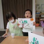 台紙の上には木の幹とお日様が貼ってあり、始めに木の幹に手型を押して