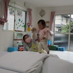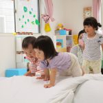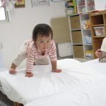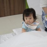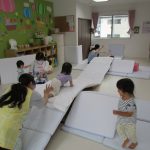 今日は0・1歳児さんは布団のお山で遊び、2歳児さんは製作を