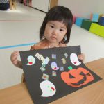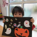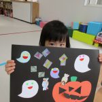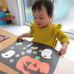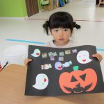 子ども達はかぼちゃには目・鼻・口を貼り、おばけには小さなシールで