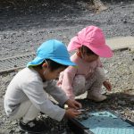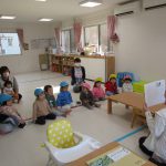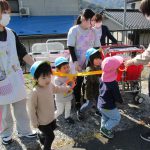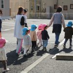 今日はお休みのお友達がいたので1・2歳児さん共、お散歩カーに乗って